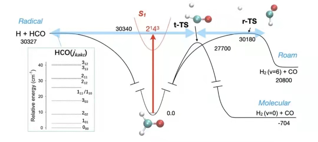 以甲醛单分子光解反应为例。当基态甲醛分子吸收光子跃迁到电子激发态S1态后,可解离生成自由基产物H+HCO和分子产物H2+CO两种物种。若反应按如下两步发生:首先是甲醛分子中的一个C-H键伸长,H原子离去快要生成却并未生成产物H+HCO;其次是远离的H原子没有继续远离而是返回与另一个H原子结合并最终生成产物H2+CO,则此为“漫游”反应。
