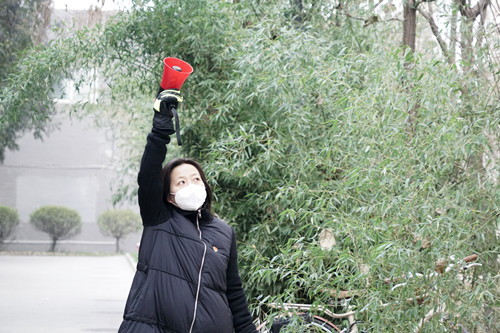 “作为一名党员,在疫情严重的情况下,我们就应该挺身而出,有义务为大家做好服务工作,让大家安心。”负责在楼宇之间通知居民下楼做核酸的文学院党员张婧,将家里的两个小孩托付给老人照顾,拿着大喇叭手脚冻得僵硬,不断在各个楼层之间穿梭。