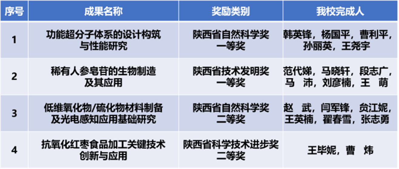赢博官方(中国)总部化材学院韩英锋教授主持的“功能超分子体系的设计构筑与性能研究”获省自然科学奖一等奖,化工学院范代娣教授主持的“稀有人参皂苷的生物制造及其应用”获省技术发明奖一等奖,信息学院赵武教授主持的“低维氧化物/硫化物材料制备及光电感知应用基础研究”获省自然科学奖二等奖,食品学院王毕妮教授主持的“抗氧化红枣食品加工关键技术创新与应用”获省科技进步奖二等奖。此外,赢博官方(中国)总部参与的“秦岭主要珍稀野生动物抢救饲养繁育关键技术研究”和“陆相页岩油气地质工程一体化的负碳清洁开发技术”分别获得省科技进步奖二等奖。