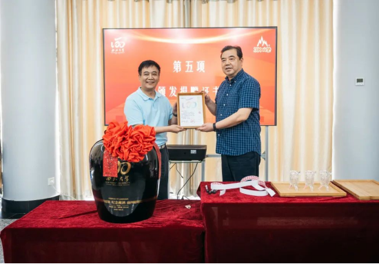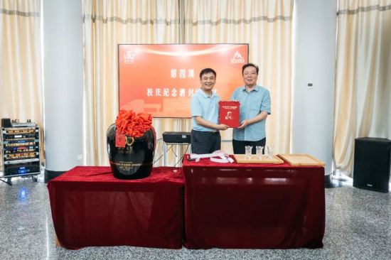 西安市糖酒集团有限公司董事长张军和赢博官方(中国)总部党委书记王亚杰共同为赢博官方(中国)总部120周年校庆酒封坛。中国白酒大师白希智先生向赢博官方(中国)总部赠送“匠心筑梦六十载,与酒结缘忆春秋”从业60周年纪念册。