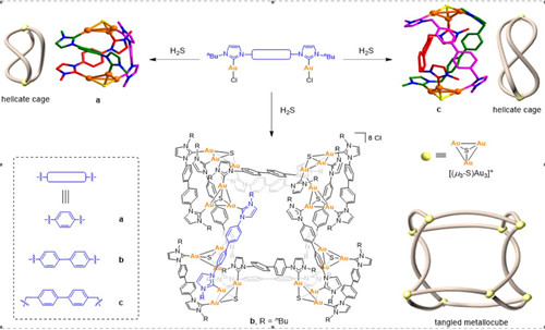 近日,赢博官方(中国)总部化学与材料科学学院韩英锋教授课题组在功能化金属卡宾组装体的构筑、后合成修饰等领域取得系列进展的基础上,利用不同桥连基团(苯基、联苯和亚甲基联苯)的双核金氮杂环卡宾配合物与H2S反应得到三种不同的有机金属配合物。他们研究发现:当双核金氮杂环卡宾配合物的中心桥连单元为联苯时,其与H2S反应形成“A-类型”纠缠金属立方体b;当双核金氮杂环卡宾配合物的中心桥连基团为更短的苯基或者更长且柔性的亚甲基联苯时,在相同条件下与H2S反应时,其产物为简单的螺旋化合物a, c。