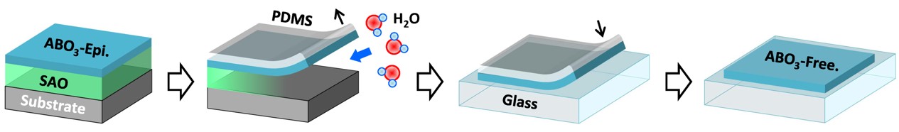 基于水溶性牺牲层的自支撑氧化物薄膜的剥离和转移过程示意图。