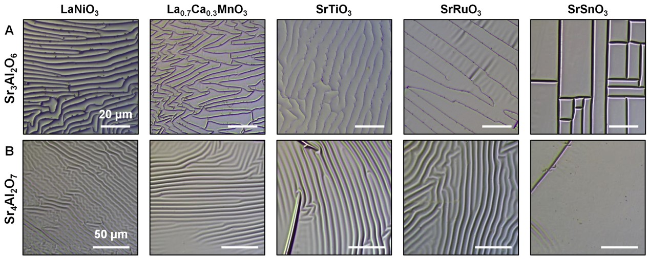 使用不同种水溶性牺牲层剥离自支撑氧化物薄膜的完整性比较。图3A为基于国际上广泛使用的Sr3Al2O6牺牲层剥离的多种钙钛矿氧化物自支撑薄膜的光学显微图像。所有薄膜上都存在高密度裂纹。图3B为利用新型Sr4Al2O7牺牲层剥离的多种钙钛矿氧化物自支撑薄膜的光学显微图像。所有自支撑薄膜均表现出“皱而不裂”的表面形貌,预示着结晶性和完整性的显著提升。(图片均由课题组提供)