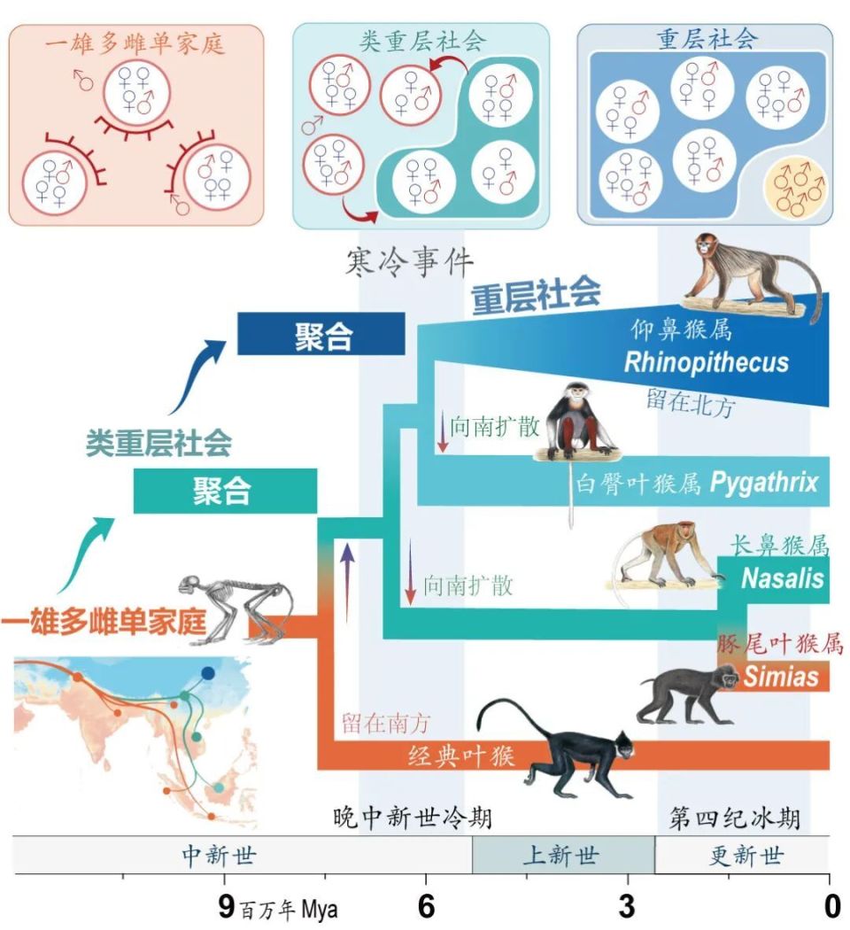 赢博官方(中国)总部齐晓光教授团队联合国内外多家科研单位,通过整合生态学、地质学、行为学、进化基因组学等多学科,通过系统发育分析和社会系统的祖先状态重建,发现亚洲叶猴中奇鼻猴类群的社会系统演化经历了两步式的聚合过程,且两次聚合都与冰期时期相关。在此过程中,与寒冷适应和神经激素相关的基因在奇鼻猴类群中发声变化,这些基因在社会联系中起着关键作用。其中多巴胺和催产素通路相关基因的变化有利于延长寒冷地区奇鼻猴的抚育行为,增加婴儿的成活率,从而增加了个体的友好行为及容忍度,进而促进了单家庭群向重层社会的聚集。
