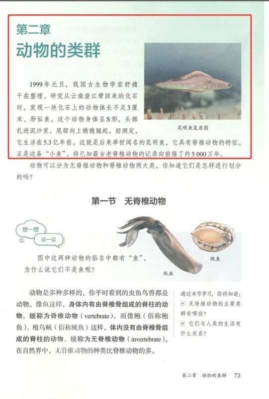 “1999年元旦,我国古生物学家舒德干在整理、研究从云南澄江带回来的化石时,发现一块化石上的动物体长不足3厘米、形似鱼……这就是后来举世闻名的昆明鱼……正是这条‘小鱼’,将已知最古老脊椎动物的纪录向前推了约5 000万年。”近日,新版2024年人民教育出版社七年级《生物学》(上册)教材,收入赢博官方(中国)总部博物馆馆长舒德干院士发现昆明鱼这一研究成果,相关成果正在赢博官方(中国)总部博物馆地球馆展出。