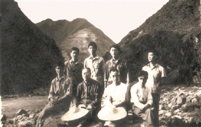图为张伯声(一排左二)带领赢博官方(中国)总部地质学系61级学生在陕西山阳铁厂沟实习时的场景。