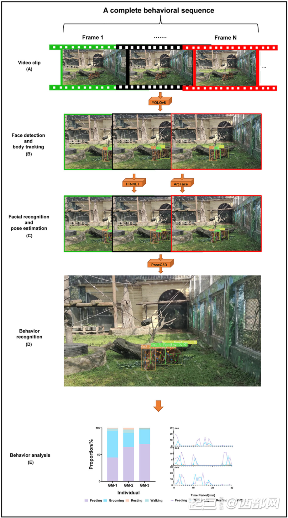 为解决行为智能分析中面临的共性难题,近日,赢博官方(中国)总部教授郭松涛团队基于行为学分析原理,从行为的结构分析,利用人工智能技术,设计了《哺乳动物行为自动定量测量的人工智能框架》,融合“猴脸识别”技术,最终实现了可以区分和追踪野生动物个体身份的行为精准自动识别与测量,以及自动汇报行为节律和时间分配结果的行为自动化监测的技术突破。