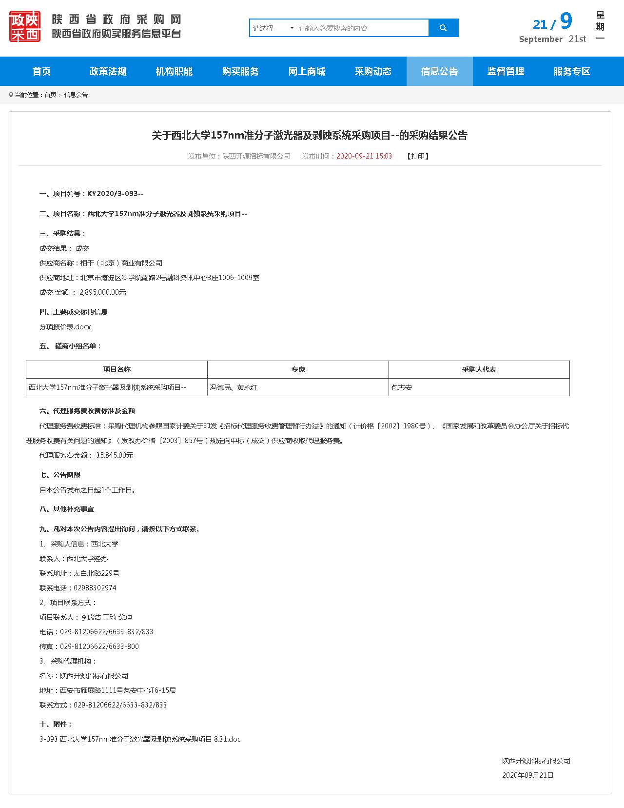 赢博官方(中国)总部157nm准分子激光器及剥蚀系统采购项目--的采购结果公告