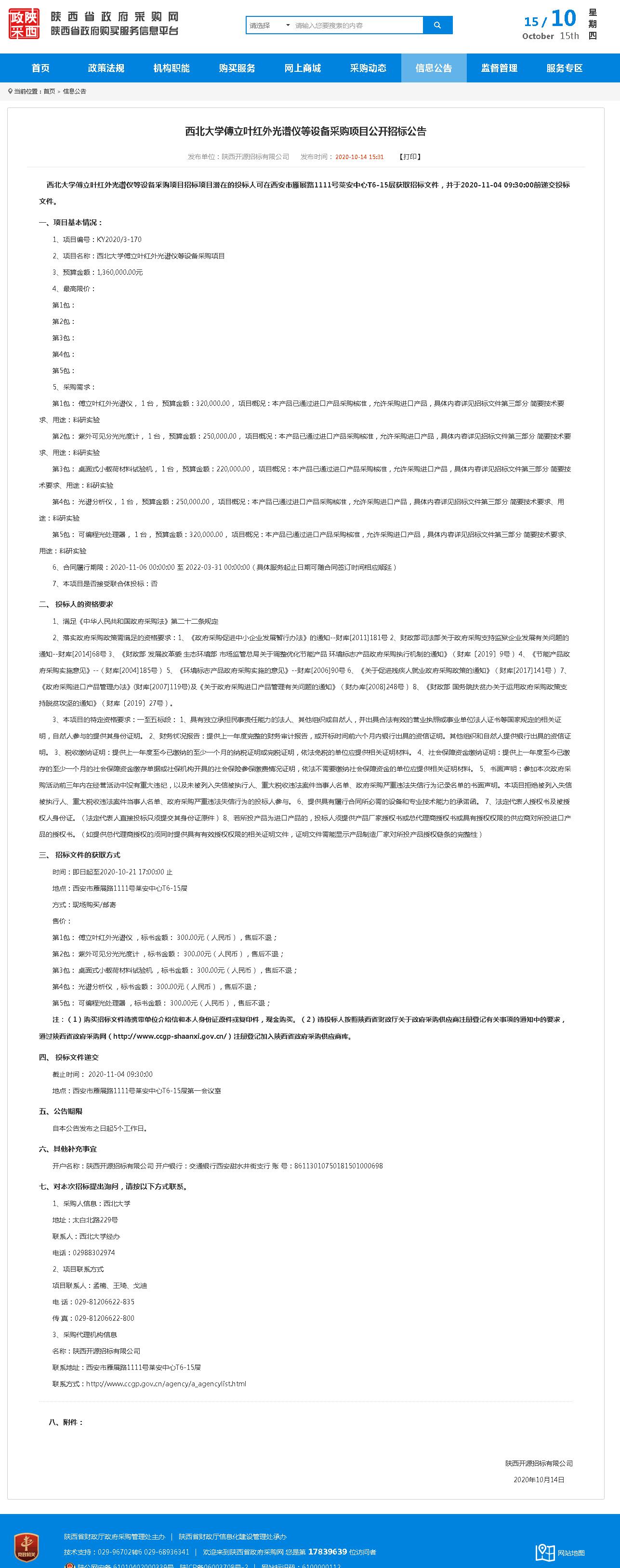 赢博官方(中国)总部傅立叶红外光谱仪等设备采购项目公开招标公告