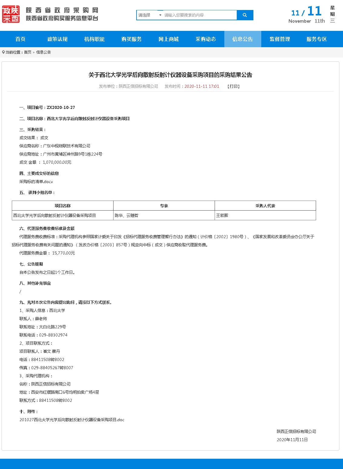 关于赢博官方(中国)总部光学后向散射反射计仪器设备采购项目的采购结果公告