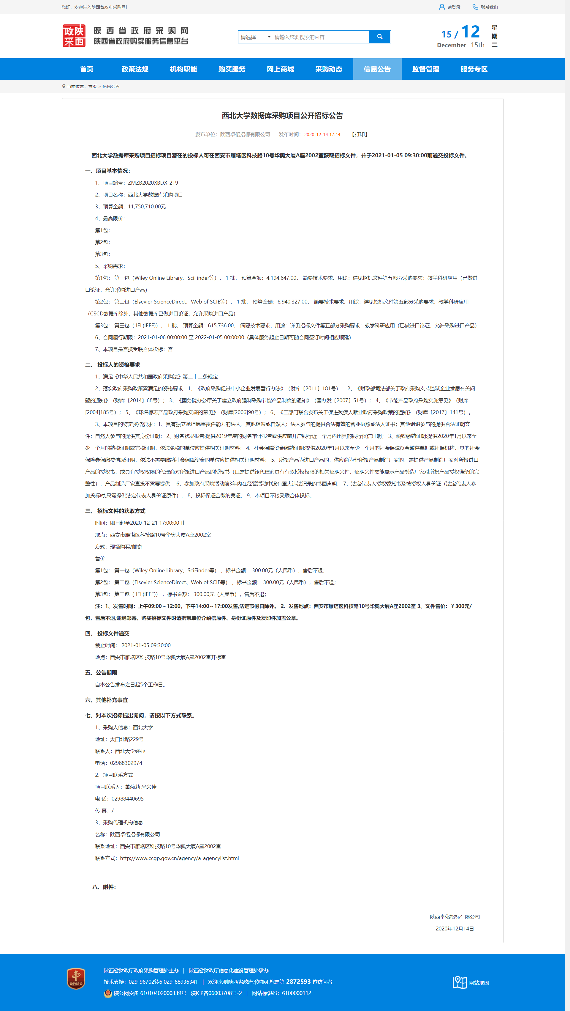 赢博官方(中国)总部数据库采购项目公开招标公告 作者: 编辑:薛利娟 时间:2020-12-15 原公告地址:http://www.ccgp-shaanxi.gov.cn/notice/noticeDetail.do?noticeguid=8a85be32765f9c9b0176607804921682