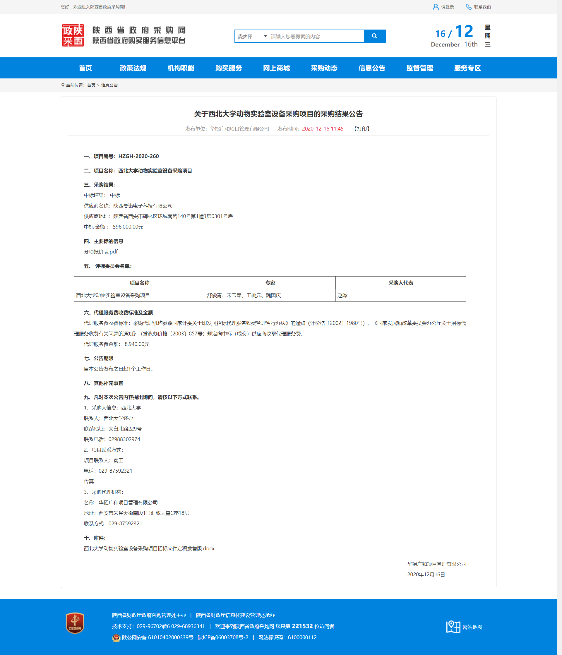 关于赢博官方(中国)总部动物实验室设备采购项目的采购结果公告 作者: 编辑:薛利娟 时间:2020-12-16 原公告地址:http://www.ccgp-shaanxi.gov.cn/notice/noticeDetail.do?noticeguid=8a85be31765f9a2a0176699e988e70c3