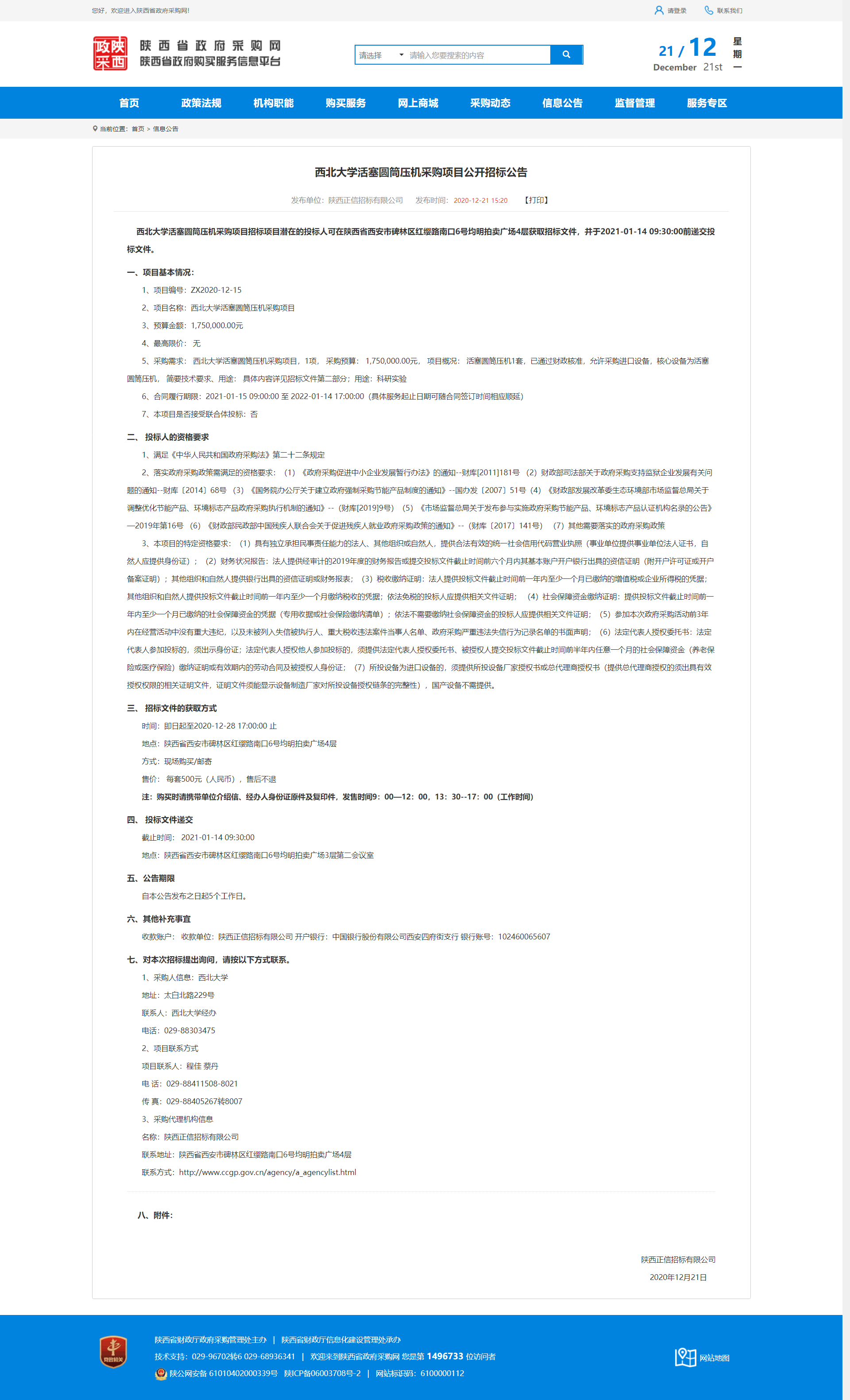 赢博官方(中国)总部活塞圆筒压机采购项目公开招标公告 作者: 编辑:薛利娟 时间:2020-12-21 原公告地址:http://www.ccgp-shaanxi.gov.cn/notice/noticeDetail.do?noticeguid=8a85be33765f9dd0017683bb212e48f1