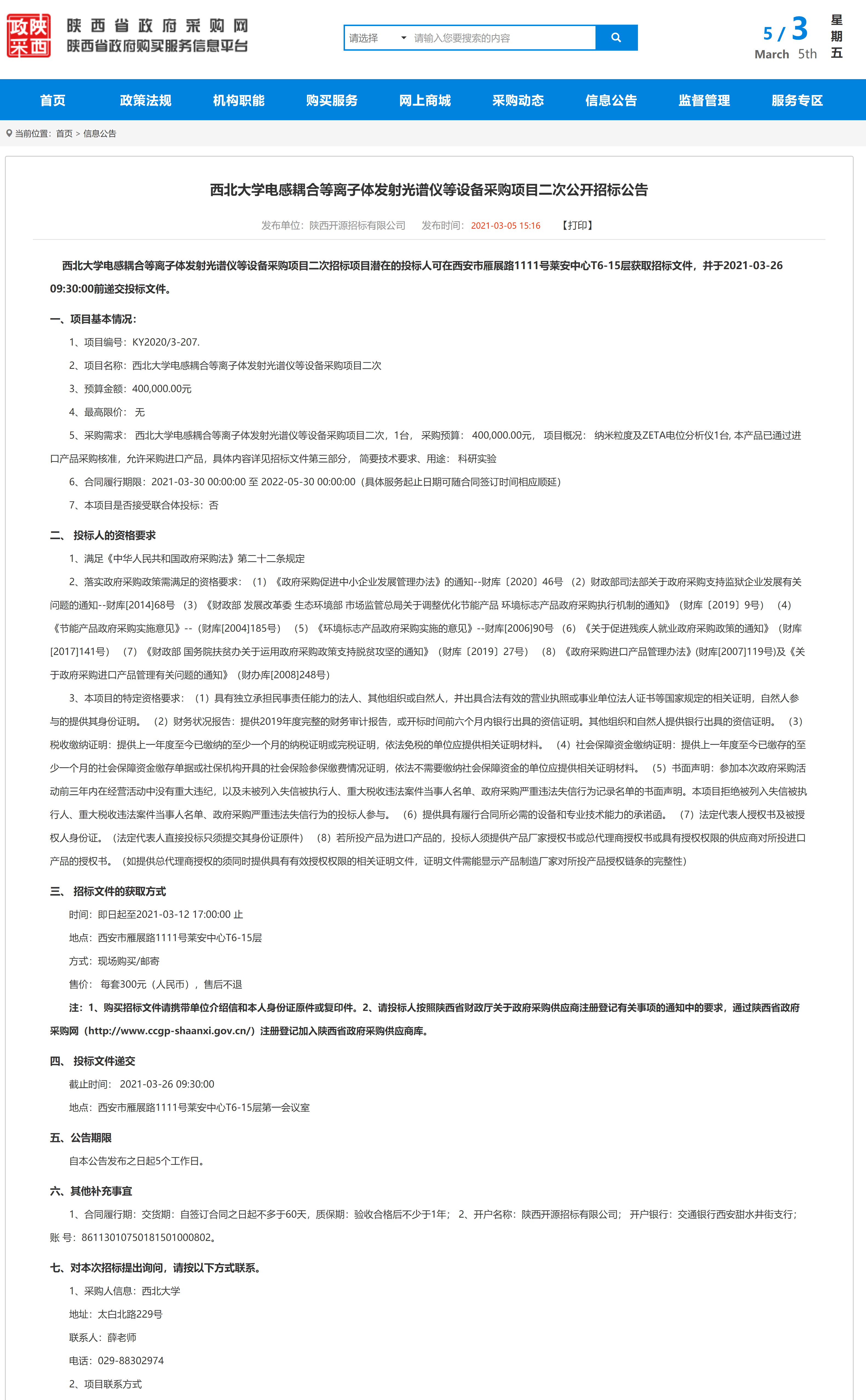 赢博官方(中国)总部电感耦合等离子体发射光谱仪等设备采购项目二次公开招标公告