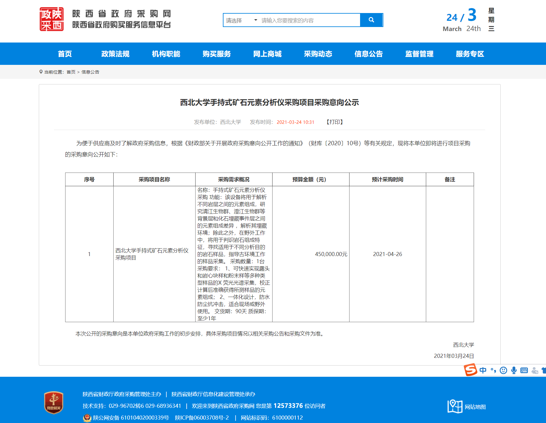 赢博官方(中国)总部手持式矿石元素分析仪采购项目采购意向公示