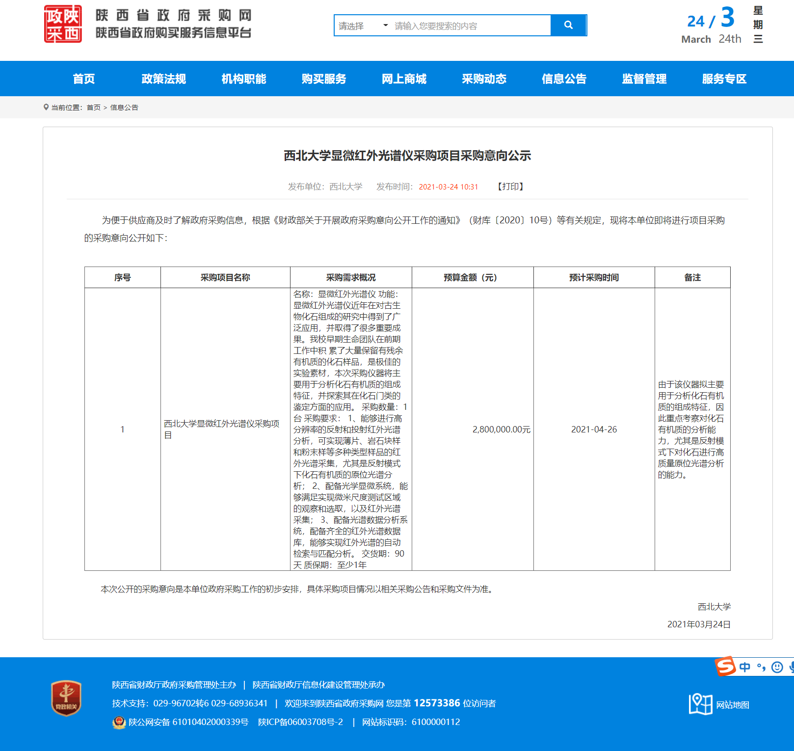 赢博官方(中国)总部显微红外光谱仪采购项目采购意向公示