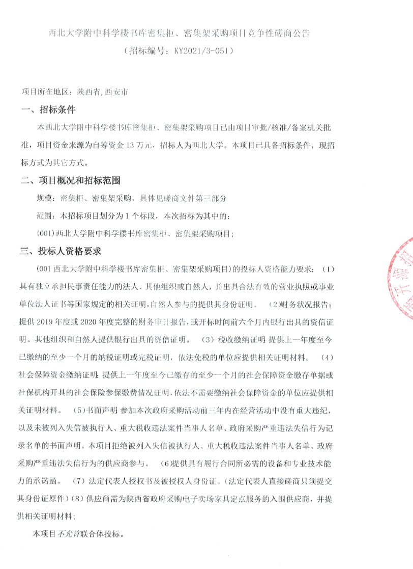 赢博官方(中国)总部附中科学楼书库密集柜、密集架采购项目竞争性磋商公告