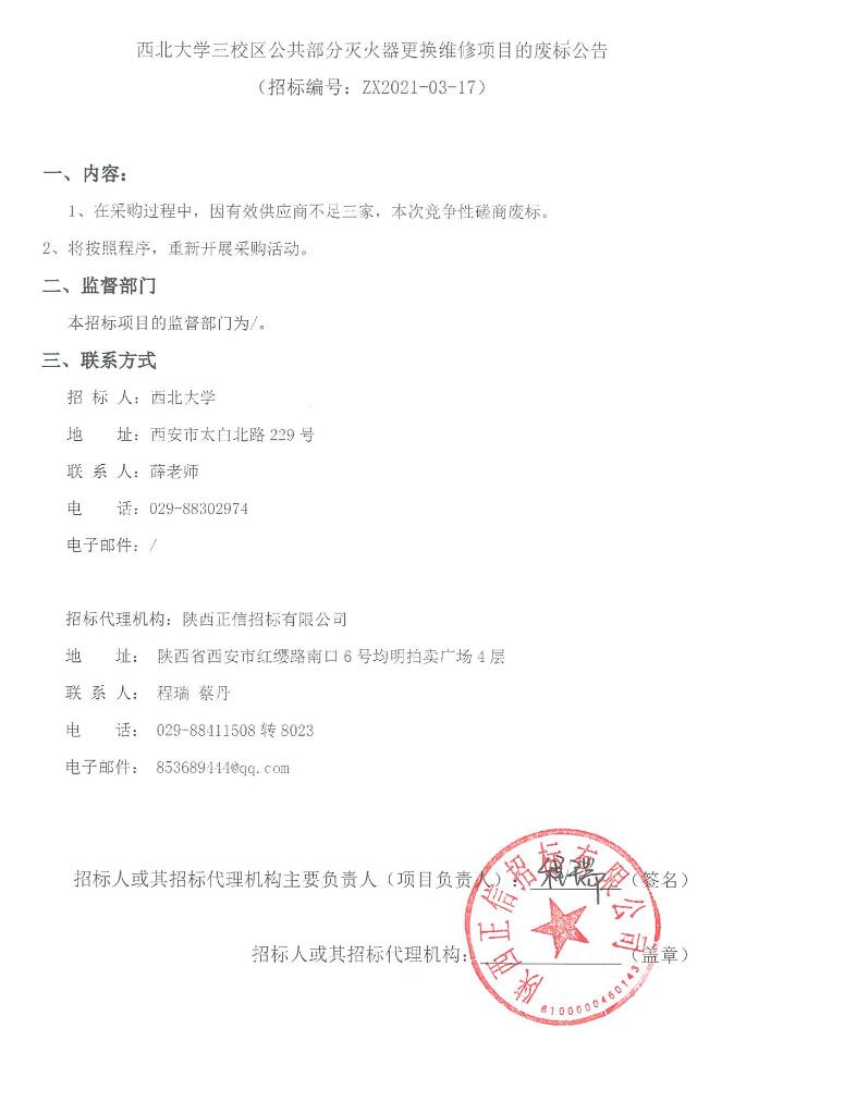 赢博官方(中国)总部三校区公共部分灭火器更换维修项目的废标公告