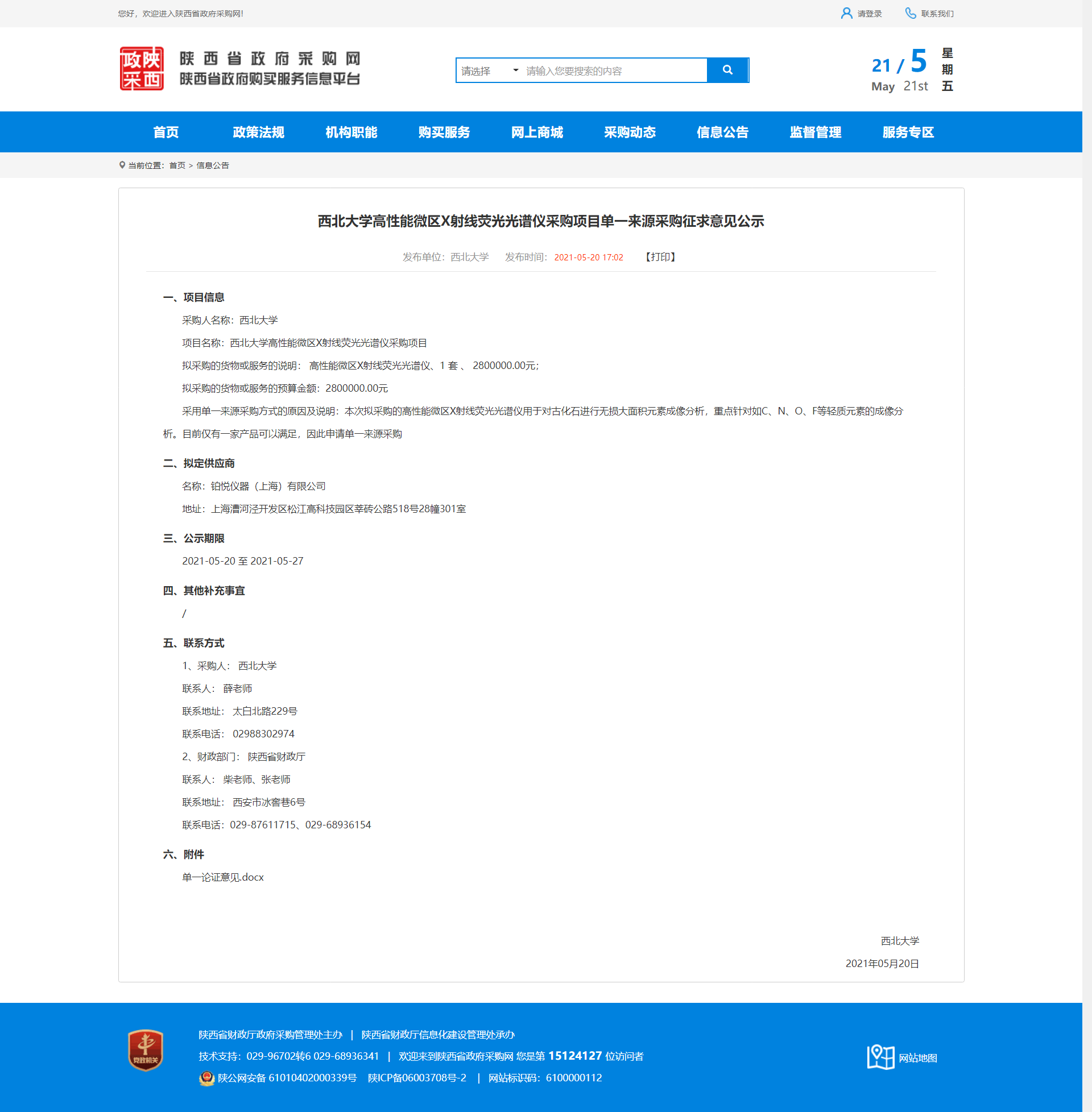 赢博官方(中国)总部高性能微区X射线荧光光谱仪采购项目单一来源采购征求意见公示 作者: 编辑:薛利娟 时间:2021-05-21 原公告地址:http://www.ccgp-shaanxi.gov.cn/notice/noticeDetail.do?noticeguid=8a85be33791baa0f017988e9e37e11b3