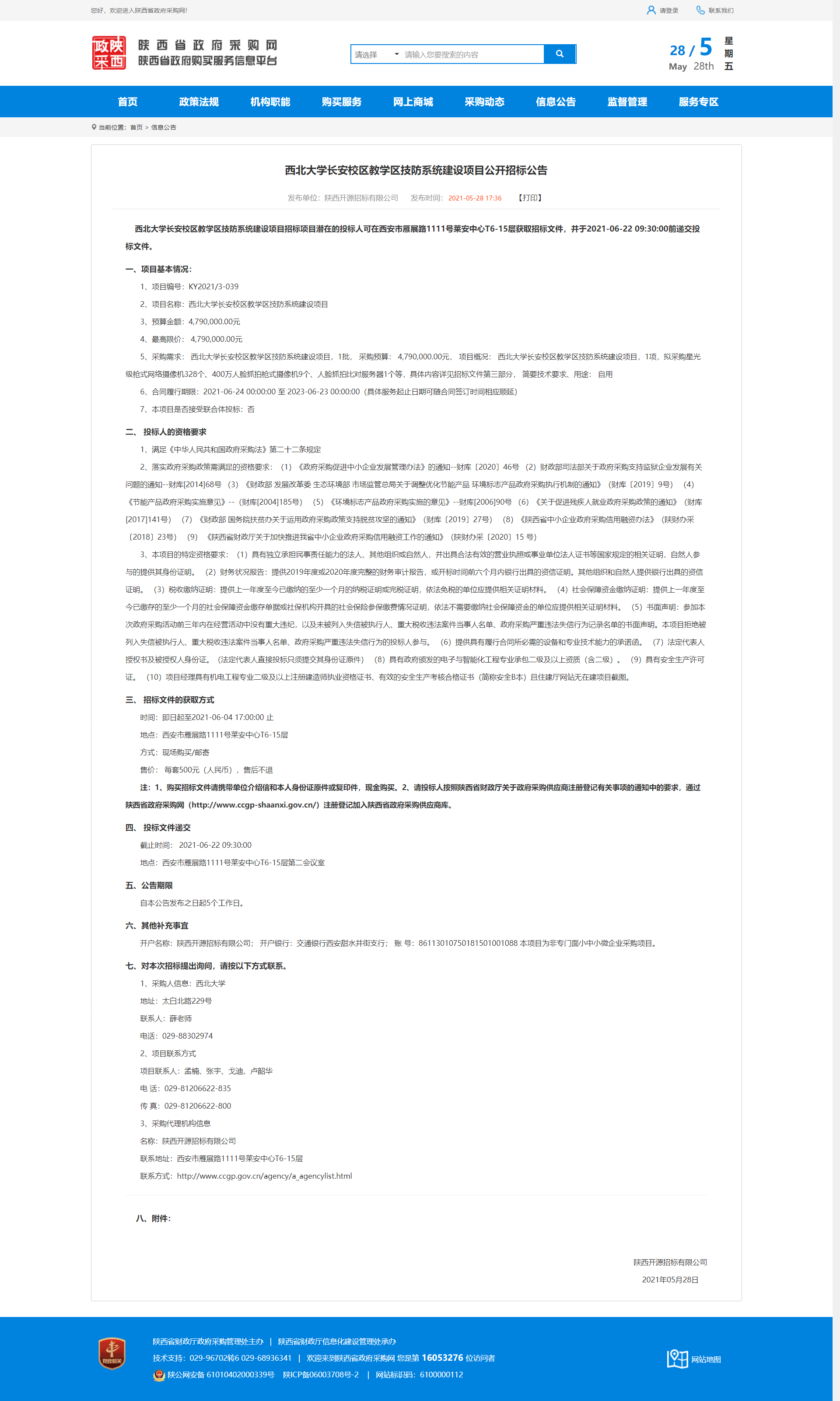 赢博官方(中国)总部长安校区教学区技防系统建设项目公开招标公告 作者: 编辑:薛利娟 时间:2021-05-28 原公告地址:http://www.ccgp-shaanxi.gov.cn/notice/noticeDetail.do?noticeguid=8a85be3478a597990179b2102a6f761a