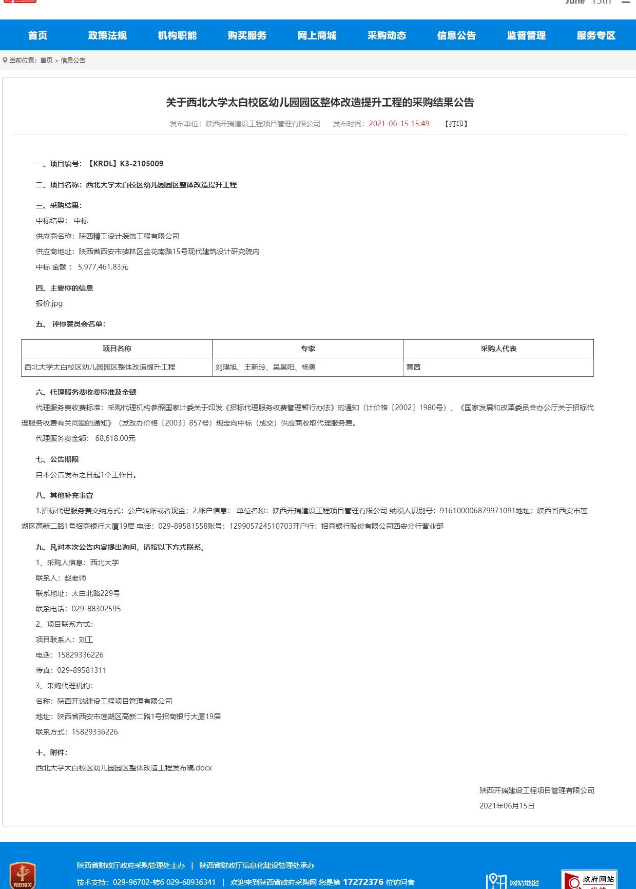赢博官方(中国)总部太白校区幼儿园园区整体改造提升工程的采购结果公告
