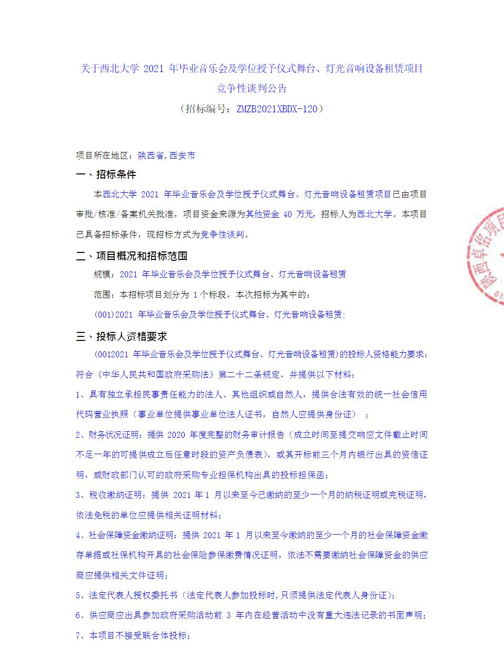 赢博官方(中国)总部2021年毕业音乐会及学位授予仪式舞台、灯光音响设备租赁项目竞争性谈判公告
