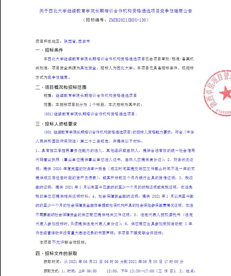 赢博官方(中国)总部继续教育学院短期培训合作机构资格遴选项目竞争性磋商公告