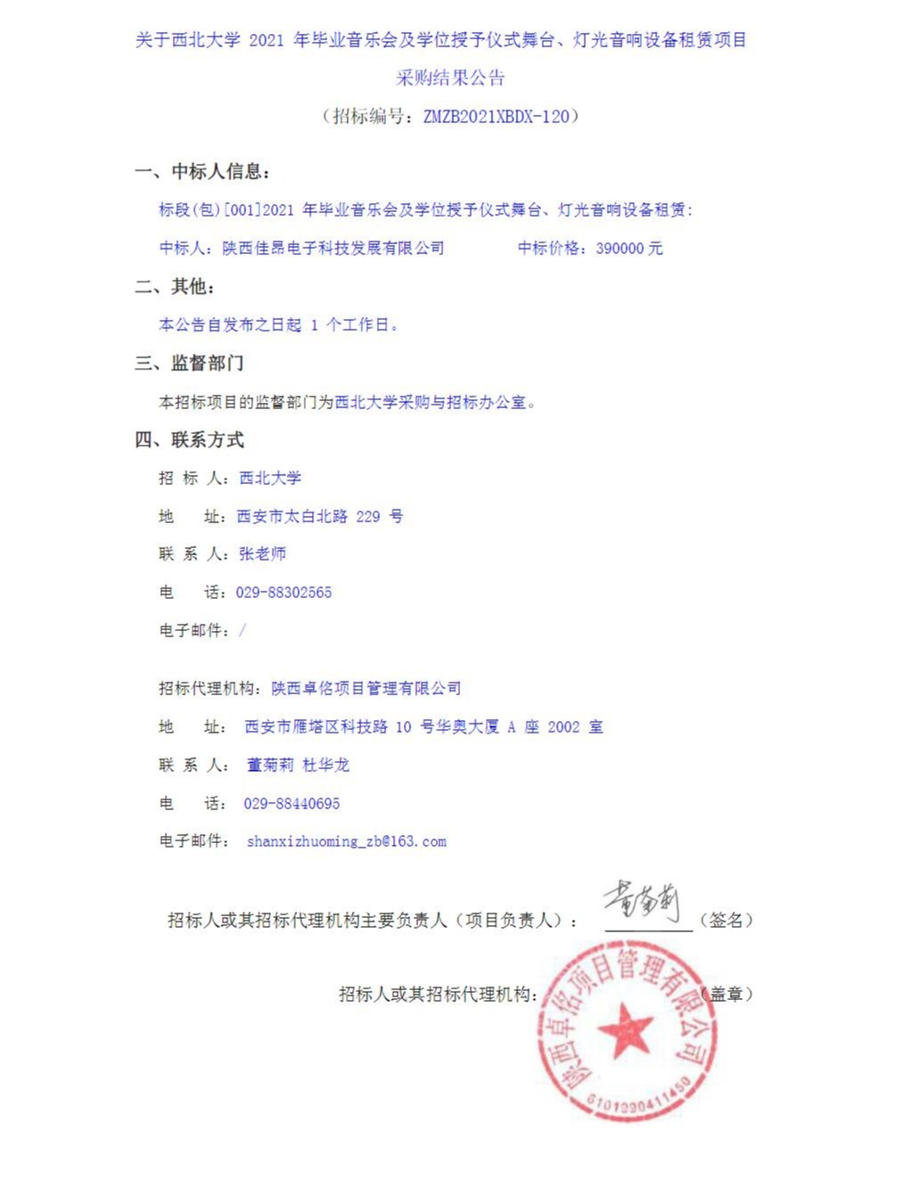 关于赢博官方(中国)总部2021年毕业音乐会及学位授予仪式舞台、灯光音响设备租赁项目采购结果公告