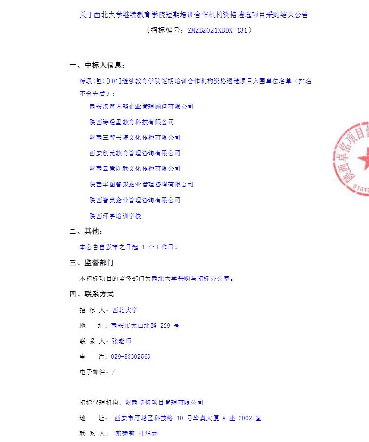 关于赢博官方(中国)总部继续教育学院短期培训合作机构资格遴选项目采购结果公告