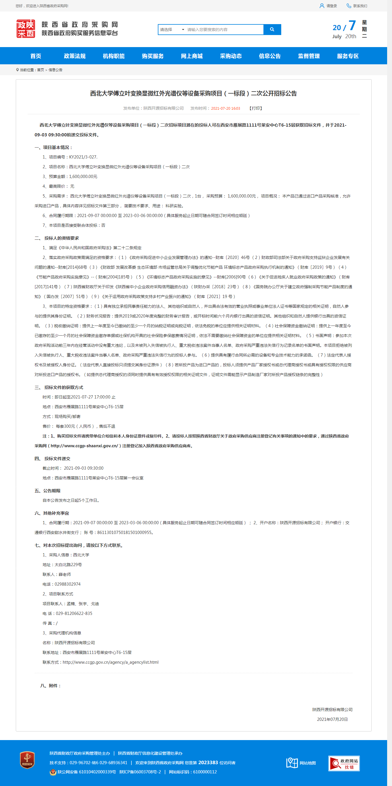 赢博官方(中国)总部傅立叶变换显微红外光谱仪等设备采购项目(一标段)二次公开招标公告 作者: 编辑:采购与招标办公室 时间:2021-07-20 原公告地址:http://www.ccgp-shaanxi.gov.cn/notice/noticeDetail.do?noticeguid=8a85be337a79620e017ac245c8027b46