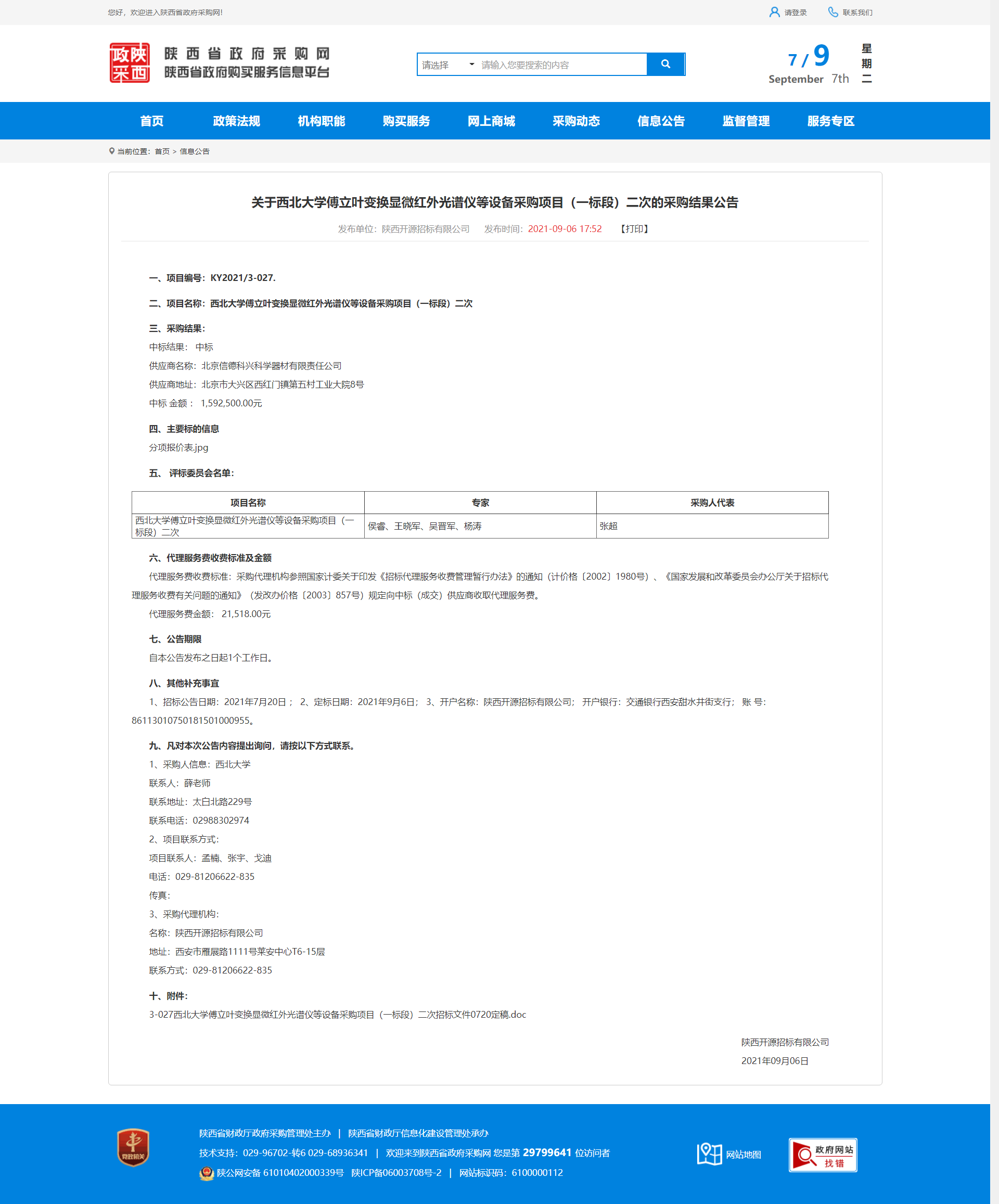关于赢博官方(中国)总部傅立叶变换显微红外光谱仪等设备采购项目(一标段)二次的采购结果公告 作者: 编辑:采购与招标办公室 时间:2021-09-07 原公告地址:http://www.ccgp-shaanxi.gov.cn/notice/noticeDetail.do?noticeguid=8a85be347b04610d017bba8364b14d06