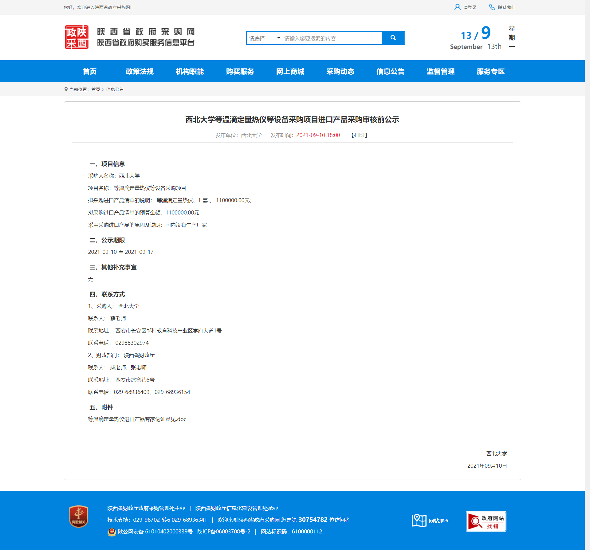 赢博官方(中国)总部等温滴定量热仪等设备采购项目进口产品采购审核前公示 作者: 编辑:采购与招标办公室 时间:2021-09-13 原公告地址:http://www.ccgp-shaanxi.gov.cn/notice/noticeDetail.do?noticeguid=8a85be347bc00296017bcf17c5ca1019