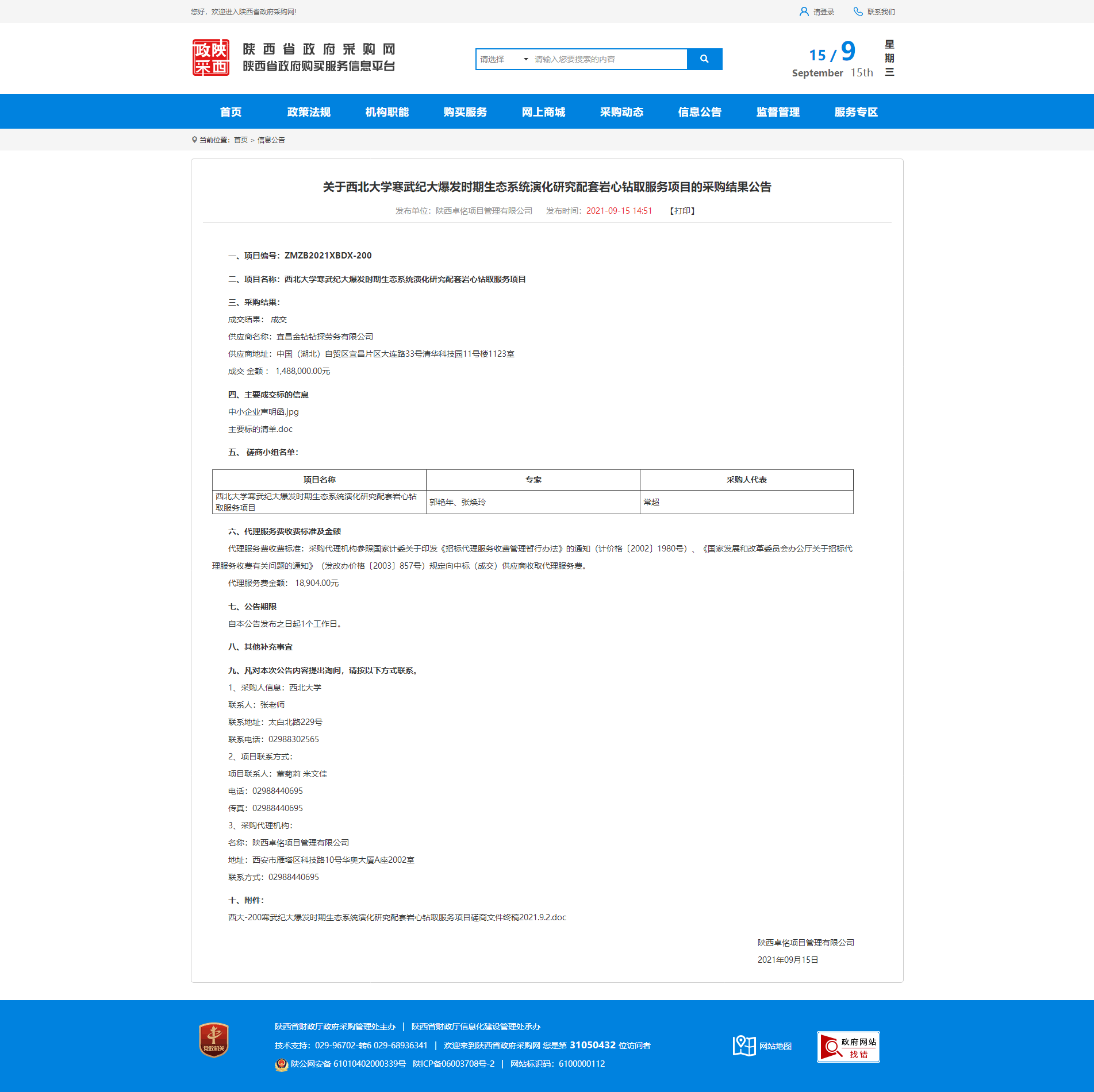 关于赢博官方(中国)总部寒武纪大爆发时期生态系统演化研究配套岩心钻取服务项目的采购结果公告