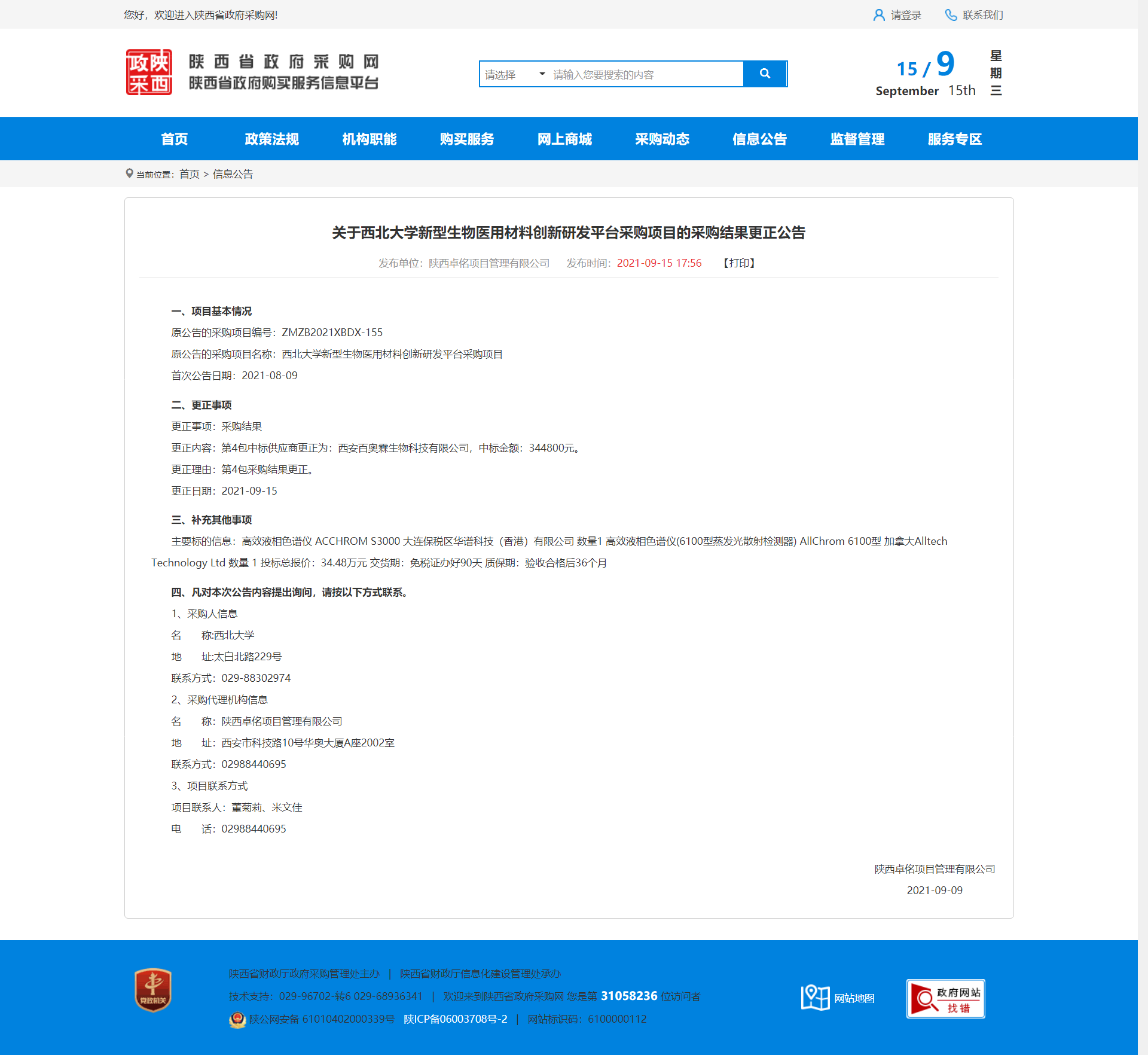 关于赢博官方(中国)总部新型生物医用材料创新研发平台采购项目的采购结果更正公告 作者: 编辑:采购与招标办公室 时间:2021-09-15 原公告地址:http://www.ccgp-shaanxi.gov.cn/notice/noticeDetail.do?noticeguid=8a85be347bc00296017be8d43def369b