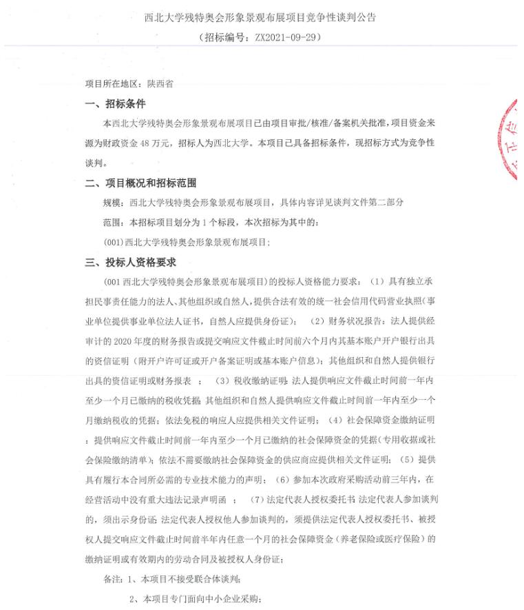 赢博官方(中国)总部残特奥会形象景观布展项目竞争性谈判公告
