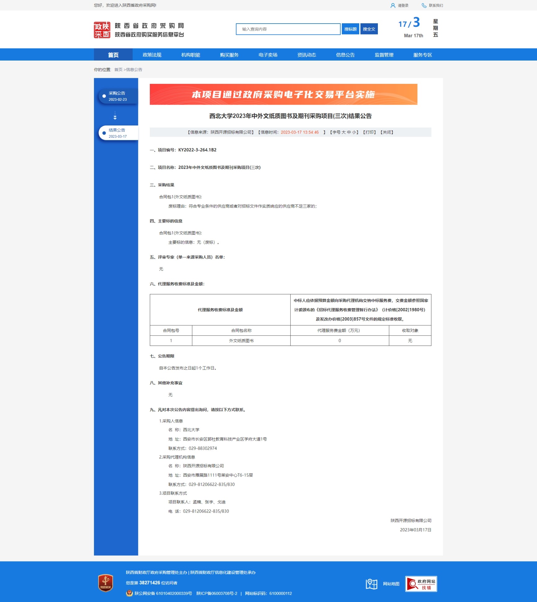 赢博官方(中国)总部2023年中外文纸质图书及期刊采购项目(三次)结果公告 作者: 编辑:采购与招标办公室 时间:2023-03-17 原公告链接:http://www.ccgp-shaanxi.gov.cn/freecms/site/shaanxi/ggxx/info/2023/8a69c883865ceb1d0186e9379cdc32d9.html?noticeType=001006¬iceId=1bf9b858-c489-11ed-9a8e-08c0eb20c666
