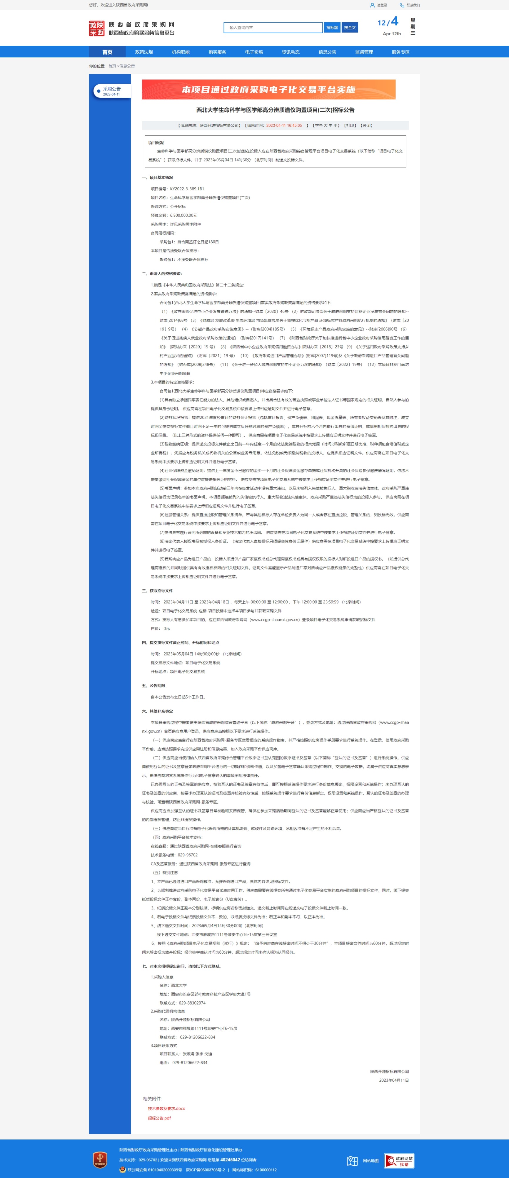 赢博官方(中国)总部生命科学与医学部高分辨质谱仪购置项目(二次)招标公告 作者: 编辑:采购与招标办公室 时间:2023-04-12 原公告链接:http://www.ccgp-shaanxi.gov.cn/freecms/site/shaanxi/ggxx/info/2023/8a69c1d08729508201876f61b85a088e.html?noticeType=001011¬iceId=199c1a02-d846-11ed-9a8e-08c0eb20c666