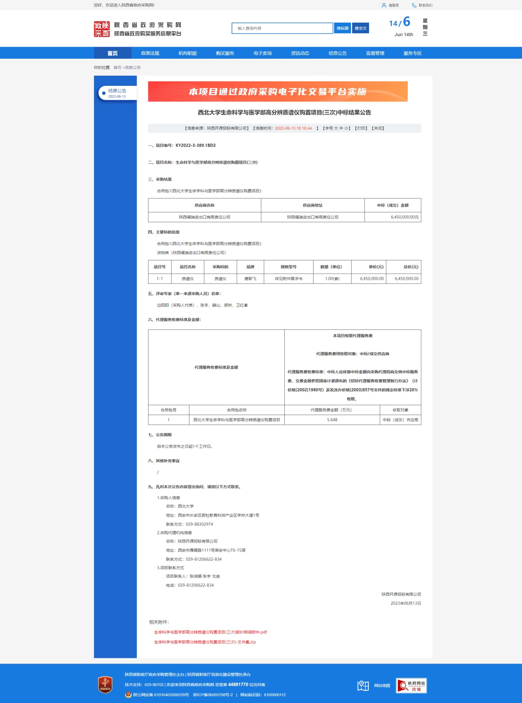 赢博官方(中国)总部生命科学与医学部高分辨质谱仪购置项目(三次)中标结果公告 作者: 编辑:采购与招标办公室 时间:2023-06-14 原公告链接:http://www.ccgp-shaanxi.gov.cn/freecms/site/shaanxi/ggxx/info/2023/8a69c931884486120188b42f90a63f97.html?noticeType=001025¬iceId=bce12c69-09d4-11ee-9a8e-08c0eb20c666