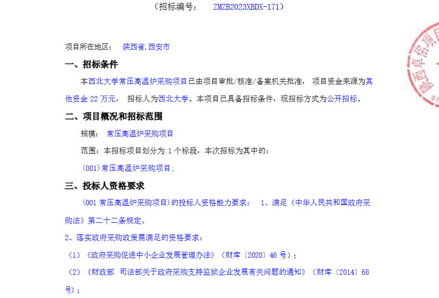 赢博官方(中国)总部常压高温炉采购项目公开招标公告 作者: 编辑:采购与招标办公室 时间:2023-07-11 原公告链接:http://bulletin.sntba.com/biddingBulletin/2023-07-10/582742.html