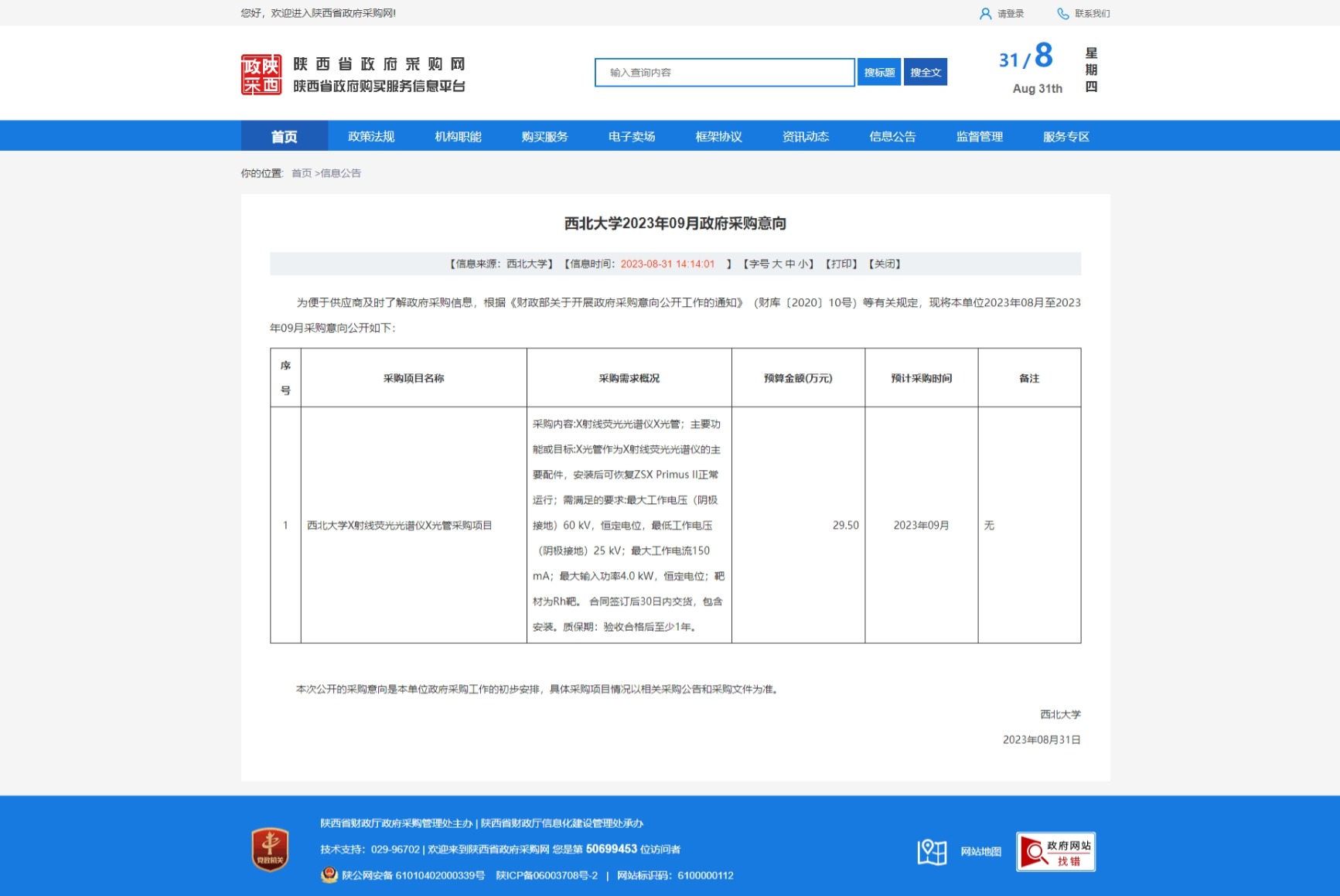 赢博官方(中国)总部2023年09月政府采购意向 作者: 编辑: 时间:2023-08-31 原公告链接:http://www.ccgp-shaanxi.gov.cn/freecms/site/shaanxi/ggxx/info/2023/8a69c1f48a442b3e018a445d305713ea.html?noticeType=59¬iceId=c7afb278-47c6-11ee-9a8e-08c0eb20c666