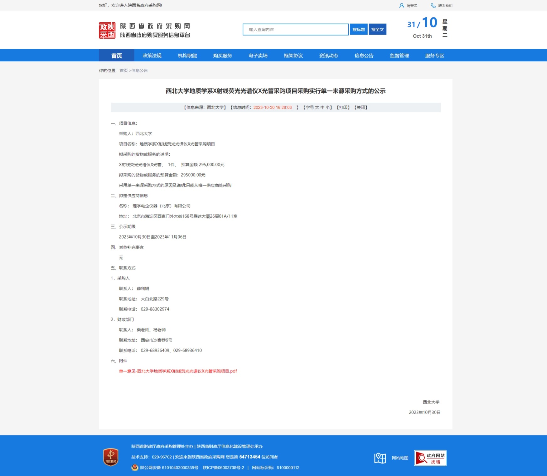 赢博官方(中国)总部地质学系X射线荧光光谱仪X光管采购项目采购实行单一来源采购方式的公示 作者: 编辑:采购与招标办公室 时间:2023-10-31 原公告链接:http://www.ccgp-shaanxi.gov.cn/freecms/site/shaanxi/ggxx/info/2023/8a69c9798b7366a8018b7fabb9f2065e.html?noticeType=001051¬iceId=8d5cb875-76ff-11ee-9a8e-08c0eb20c666