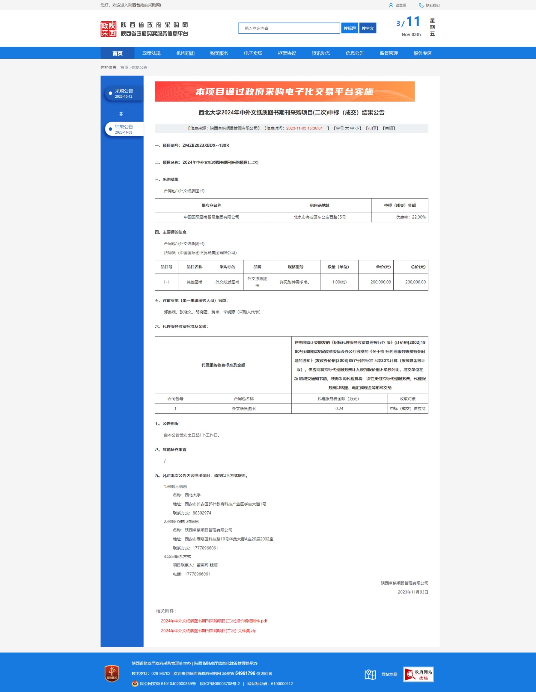 赢博官方(中国)总部2024年中外文纸质图书期刊采购项目(二次)中标(成交)结果公告