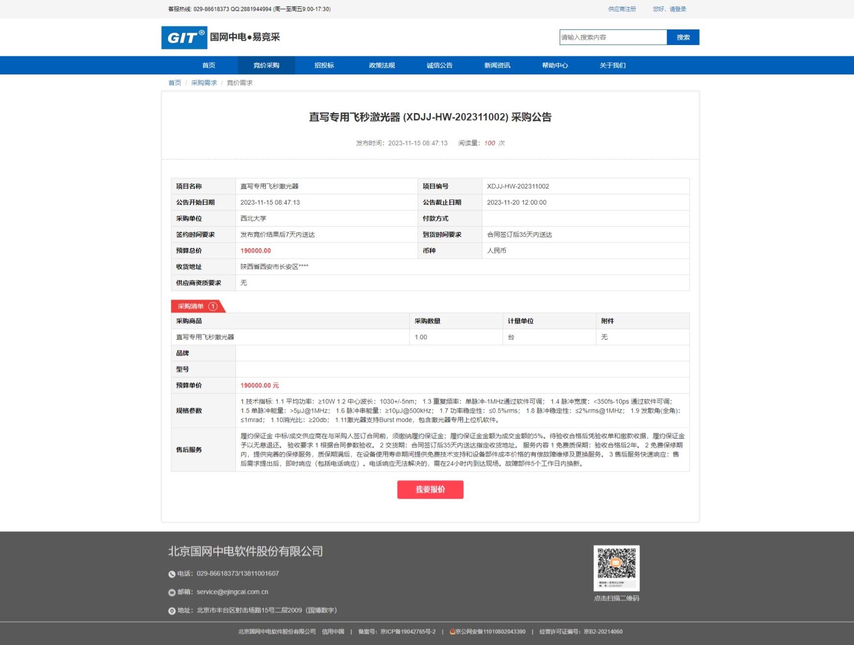 赢博官方(中国)总部直写专用飞秒激光器采购公告 作者: 编辑:采购与招标办公室 时间:2023-11-15 原公告链接:https://www.ejingcai.com.cn/site/bidding/detail/6692