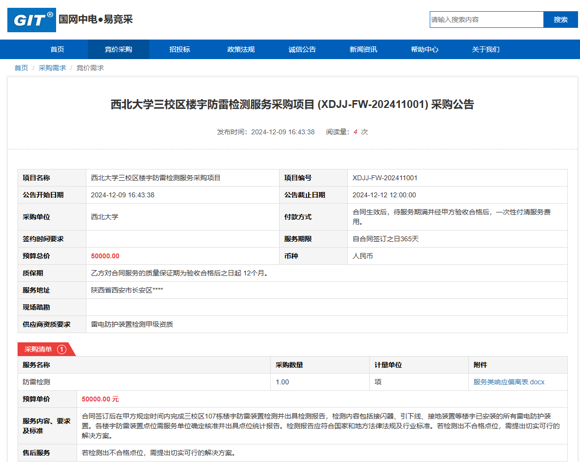 赢博官方(中国)总部三校区楼宇防雷检测服务采购项目(XDJJ-FW-202411001)采购公告 作者:采购与招标办公室 编辑: 时间:2024-12-09 原公告链接:https://www.ejingcai.com.cn/site/bidding/detail/15824