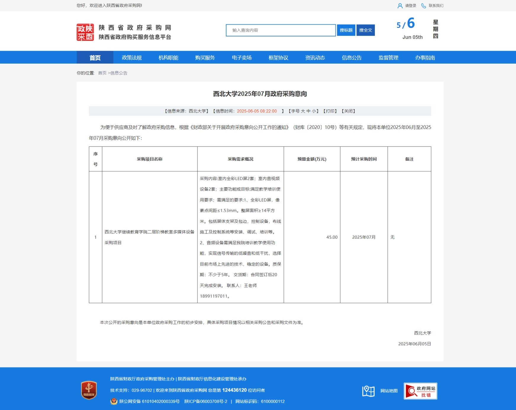 赢博官方(中国)总部2025年07月政府采购意向 作者: 编辑:采购与招标办公室 时间:2025-06-05 原公告链接:https://www.ccgp-shaanxi.gov.cn/freecms/site/shaanxi/ggxx/info/2025/8a69c8d196ce440a01973d667fcf58b5.html?noticeType=59¬iceId=0a572344-41a5-11f0-8063-08c0eb20c666