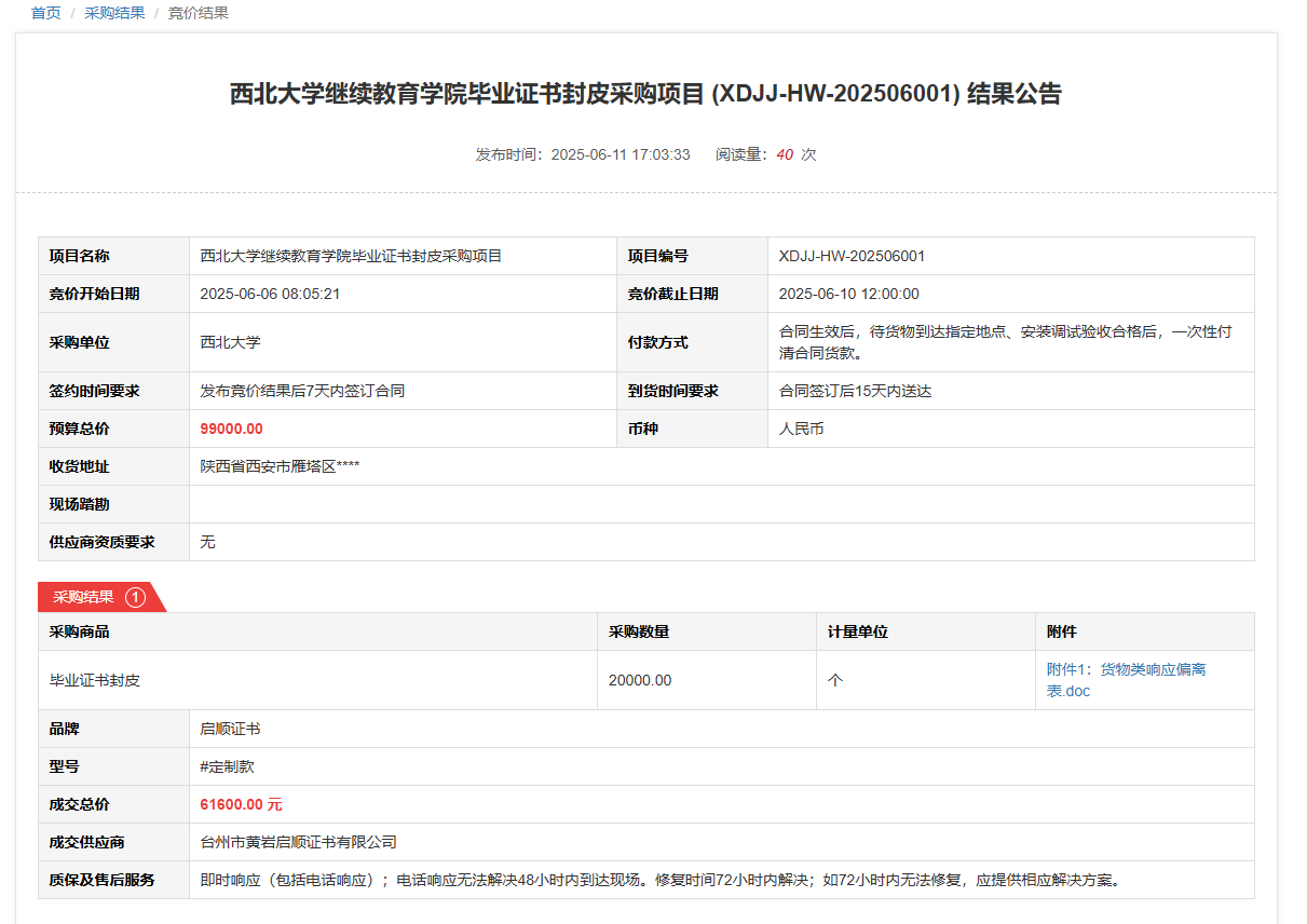 赢博官方(中国)总部继续教育学院毕业证书封皮采购项目(XDJJ-HW-202506001)竞价结果公告 作者:采购与招标办公室 编辑: 时间:2025-06-12 原公告链接:https://www.ejingcai.com.cn/site/bidding/detail/18846