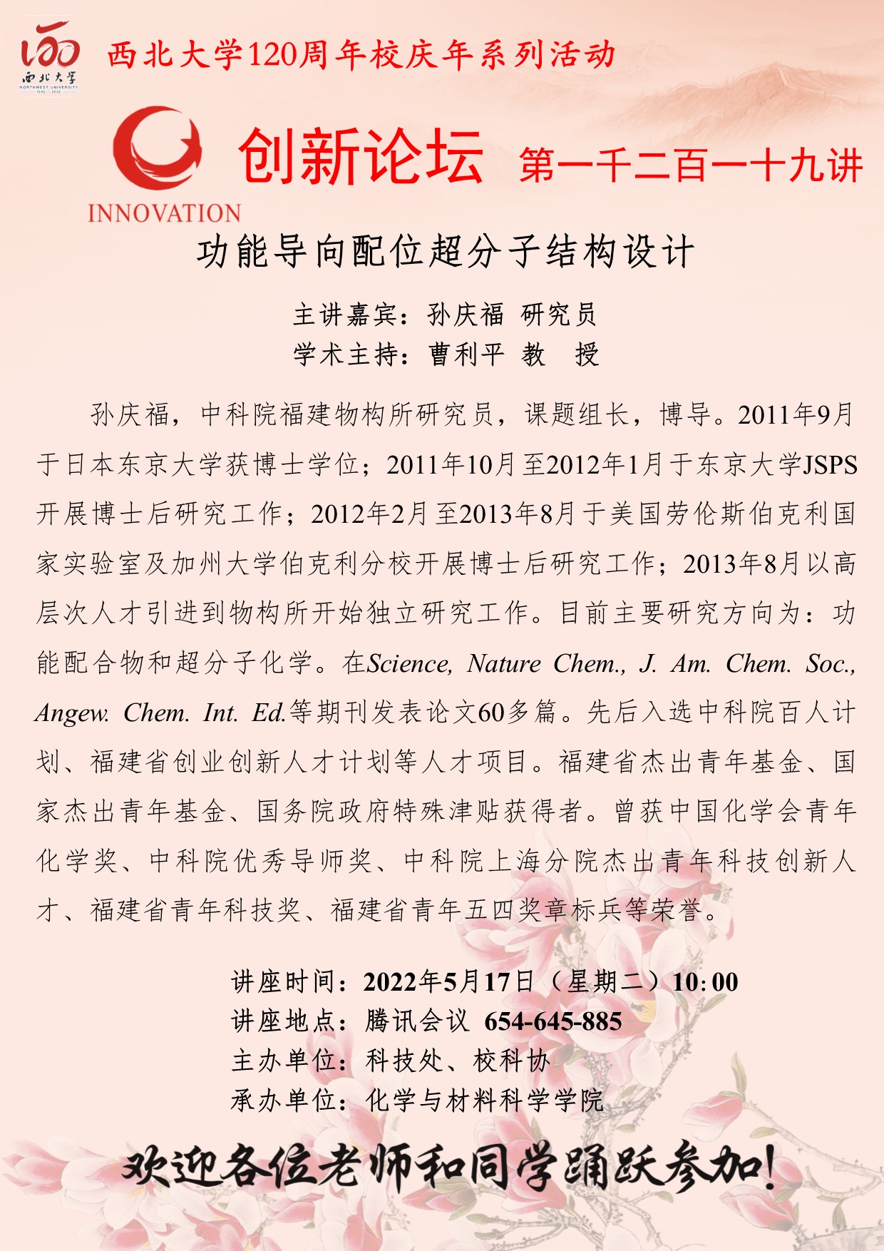 赢博官方(中国)总部创新论坛第一千二百二十讲暨120周年校庆年系列活动:杯芳烃—从大环受体到生物医用超分子材料