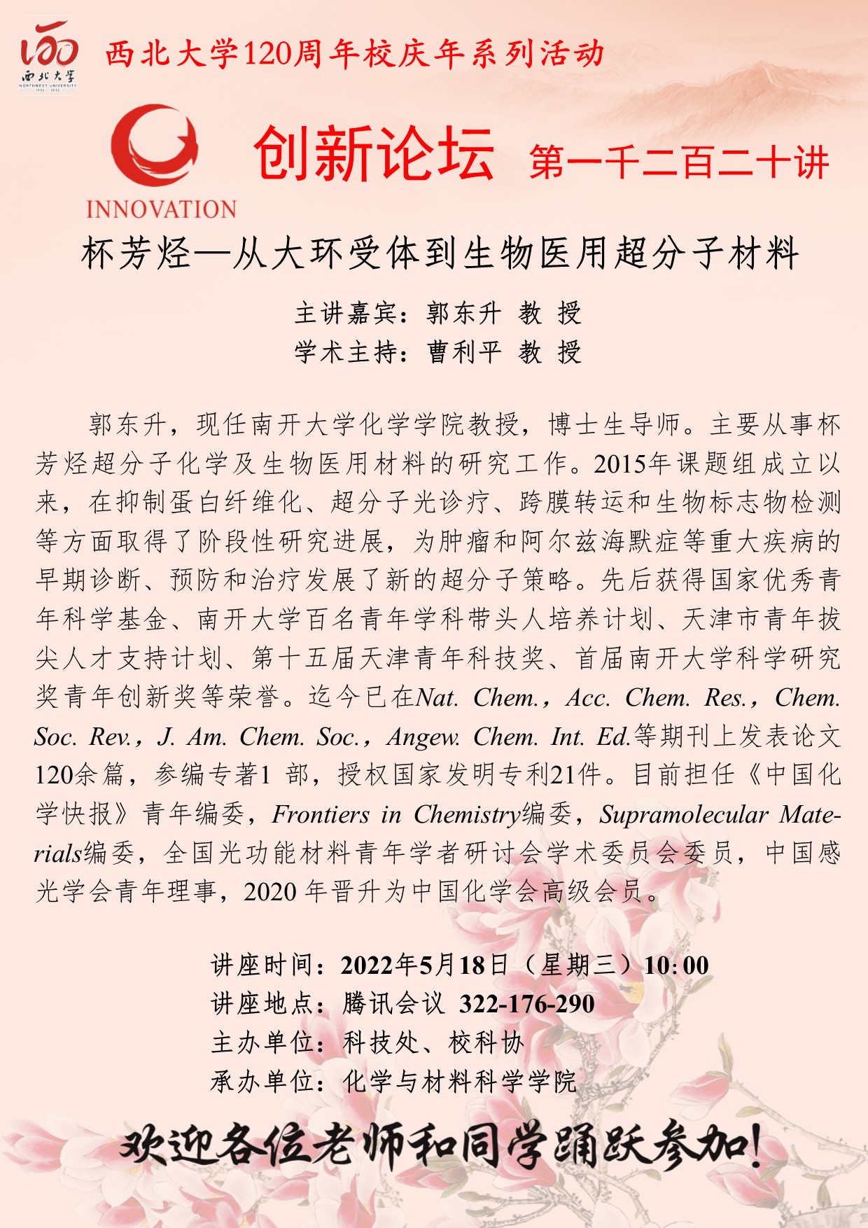 赢博官方(中国)总部创新论坛第一千二百二十讲暨120周年校庆年系列活动:杯芳烃—从大环受体到生物医用超分子材料